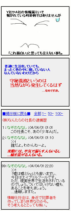 いいのだか..... こういう仕事についていない人の場合でも、個人情報や会社の極秘の情報に触れる機会はあるだろうから、 もちろんそれについての守秘義務が発生してるはずだと思うのですが。 でも、Hさんが管理人をやっている某巨大掲示板をみていると、おいおいと思う書き込みが結構ありますよね。 で、ちょくちょく裁判でHさんが呼び出されているのは有名な話で。 エイプリルフールだからって、何も考えずに書き込みしたら痛い目にあうと思いますので、どうせ嘘を書くなら 誰も傷つかない嘘を書くように心がけましょう。って。 Hさんの掲示板だってIPちゃんと記録してますもんね。 |