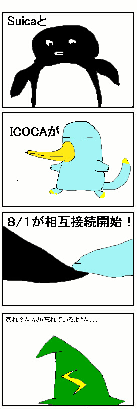 なんだか聞いた話だと、大阪近辺のCMでICOCAのイコカモノハシが東京で暴れているとの事。見てみたいけどねぇ....