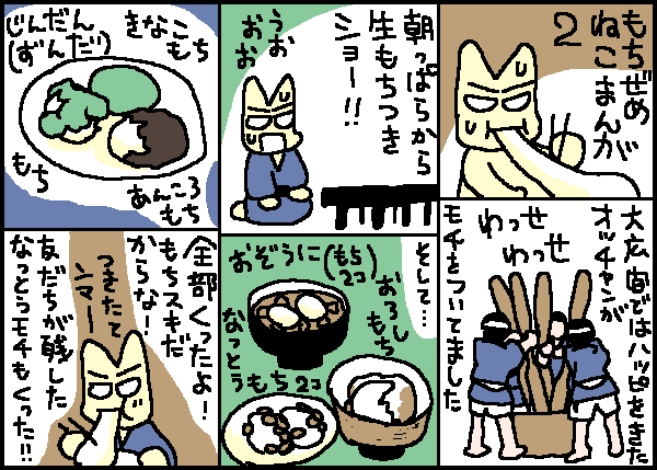 とりあえず、お雑煮、大根おろしもち、納豆からめもち、 ずんだ(枝豆に甘い味付けをしてつぶしたもの) きなこ(青い豆(枝豆?)のきなこなので、緑色だそう) あんころもち。この6種類は自動的にサーブされます。 あとは食べたいもちをおかわり自由!! 限界に挑戦したかったのはやまやまですが、 この後昼には芋煮を食べる予定だったんで 10個でやめておきました・・・ ・・・もち一個でゴハン1杯分のカロリーあるんだよな・・・