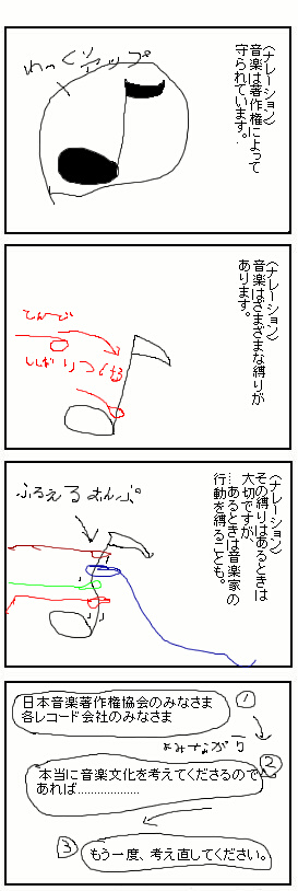 あんまし大きな声でいえないのだか、言ってはいけないのだかわからないけど、 「商品として音楽を追うばかりに音楽の発展を妨げているような気がする。」 もちろん、音楽家の人が生活をしていく上で「お金」は必要なのは言われないでもわかっているし、対価を受け取る事自体、なんら問題はないと思う。 目の前のお金ばかり追って、もっと先の収入源をつぶしているような気もしないでもないから、怖い怖い。 ネット上では、結構言われている事ではあるんですが、ジャスラックもレコード会社も見てないのか見ていないふりをしているのか。繰り返し書いたところで意味なさげなのでここにはかかないけどね.... |