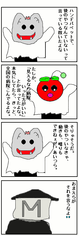.....誰のこと言っているか、分かっている人は結構いると思うけど。べつに深い意味はないんですよね(^^;; べつにやつらをキライなわけでもないし、たぶんこの2人もやつらの事を嫌っているわけじゃないと思う。ただ、それはこういう世界のお話ですから。ネタになるものはネタにしないともったいないと思ったんだろう。 とはいうものの、主体は彼らパペットであって「後の人」は裏方であって、いないものとして頭の中で処理してみなければいけないはずでして.... まあ、そんなことかいてたらいつまでつづくかわからないので..... |