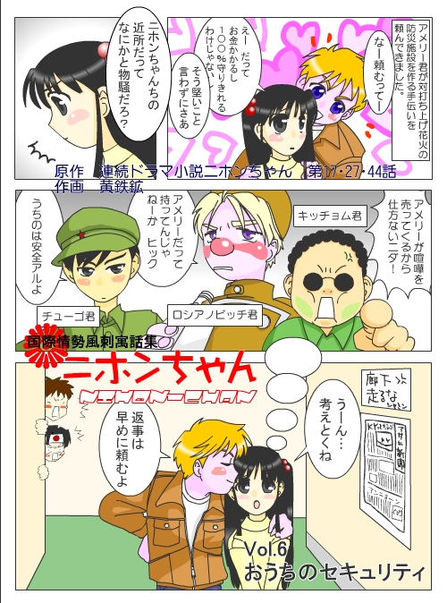 連続ドラマ小説『ニホンちゃん』は、世界各国を小学生に擬人化し、『地球町』を舞台に様々な事件の展開をくりひろげる『国際情勢風刺寓話集』です。 不特定多数の作家・絵師が執筆に参加し、その作品のジャンルはショートショート、漫画、FLASH、ゲームと多岐にわたります。